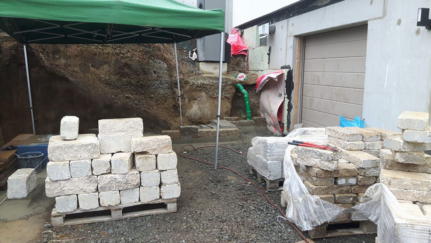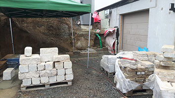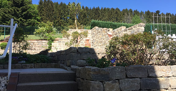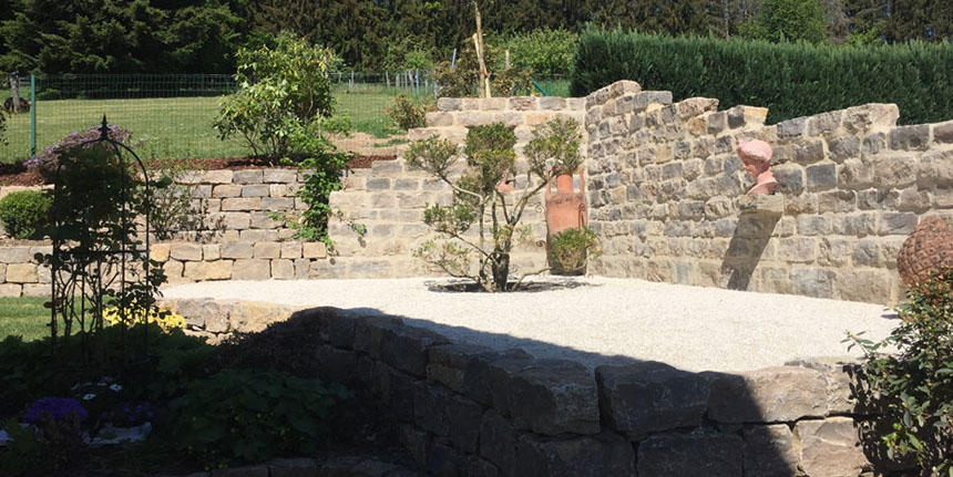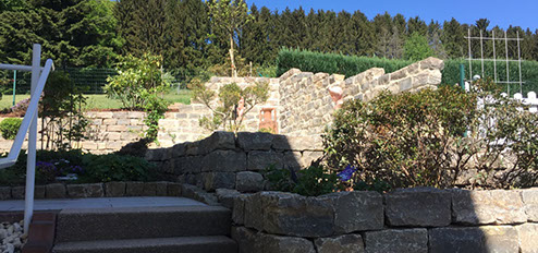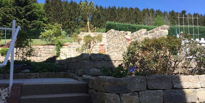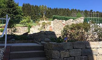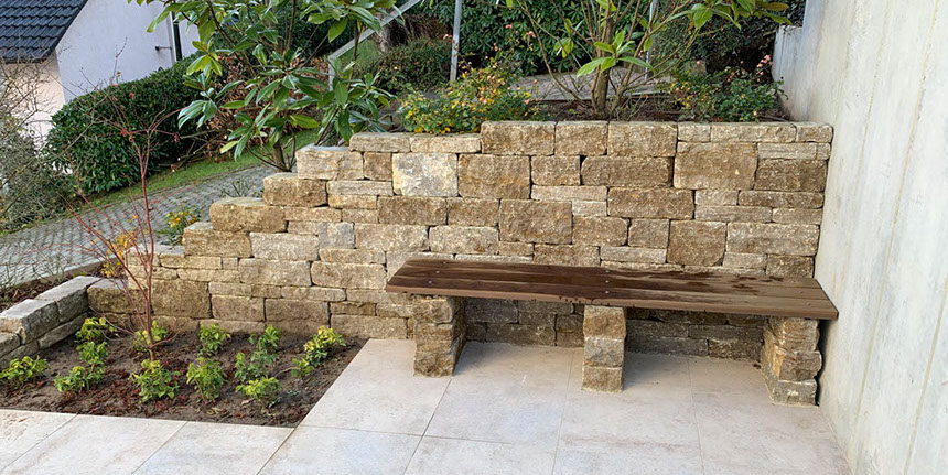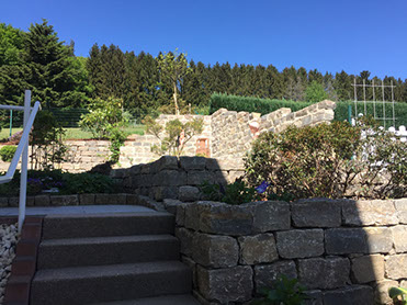 Als Abstützung wurden Muschelkalksystemmauersteine mit gesägten Lager- und Stoßfugen in geklebter Fassung gewählt.