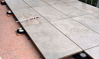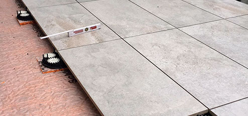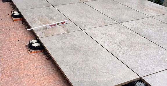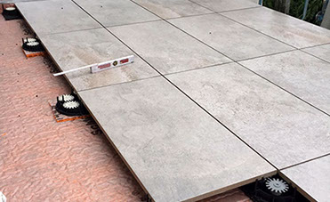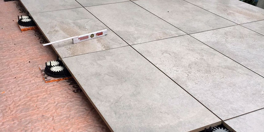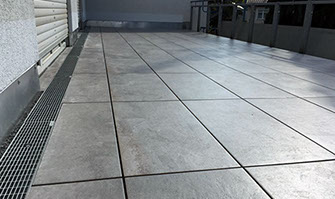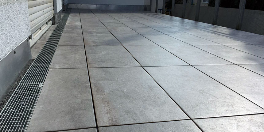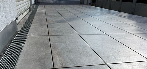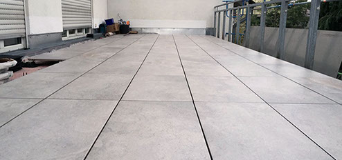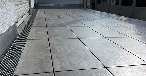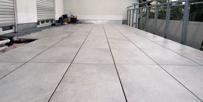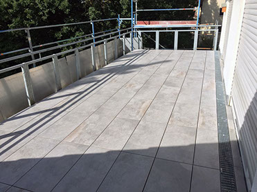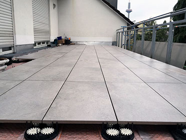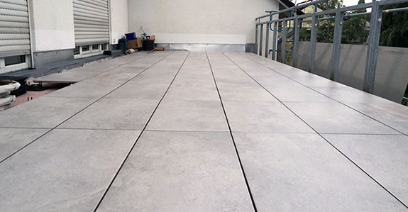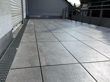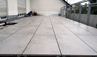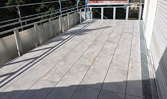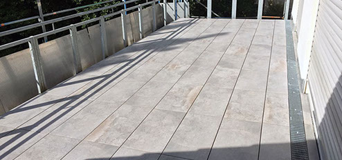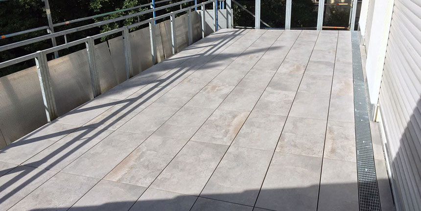 Bei diesem Projekt wurde ein Plattenbelag aus Keramik in Muschelkalkoptik gewählt. Dieser wurde im Kreuzfugenverband punktuell auf Stelzlagern verlegt, um einen schnellen Abfluss des Wassers zu gewährleisten und um eine Gewichtsersparung gegenüber einem Splittbett zu erzielen.