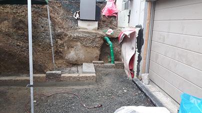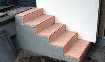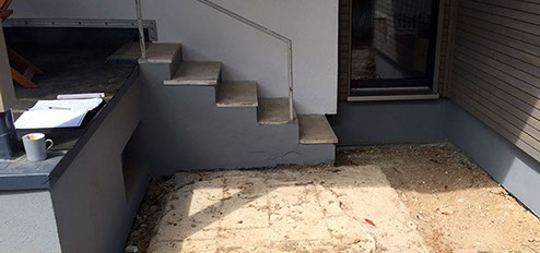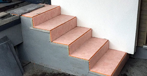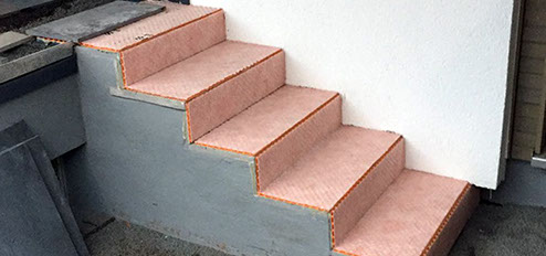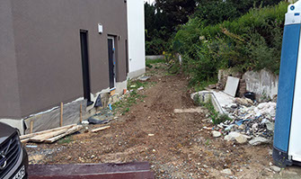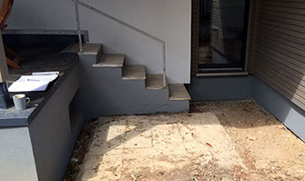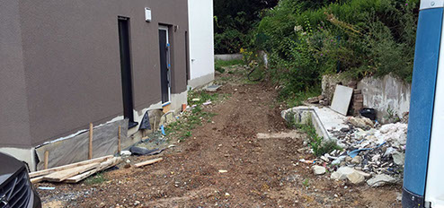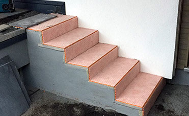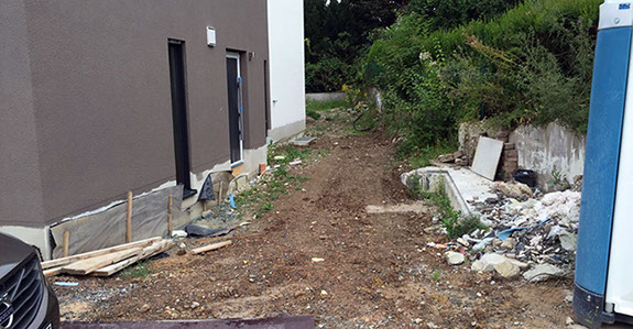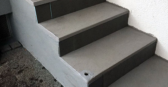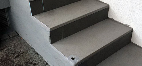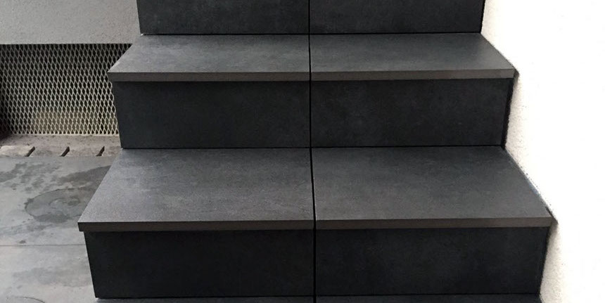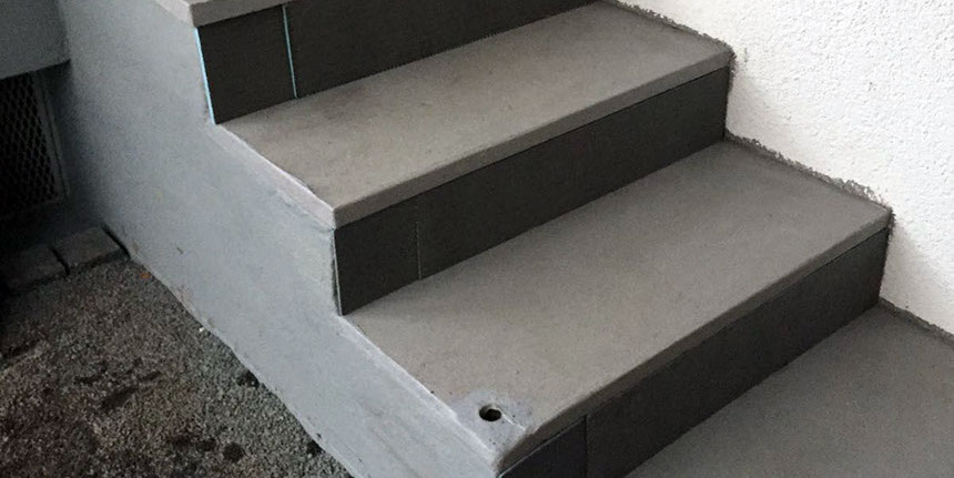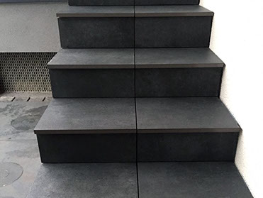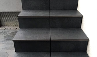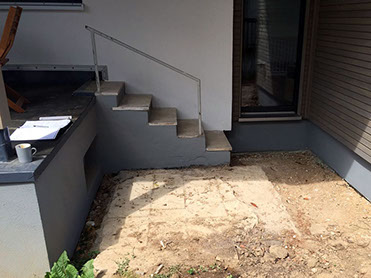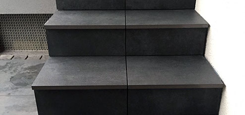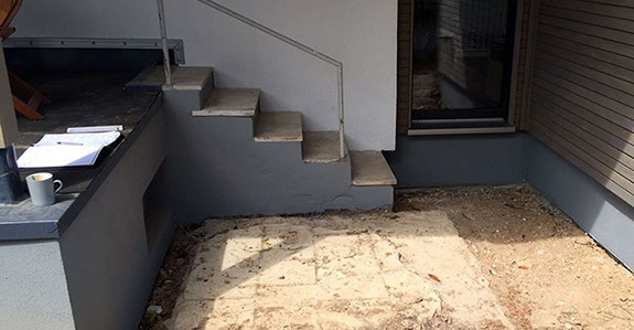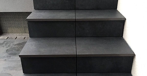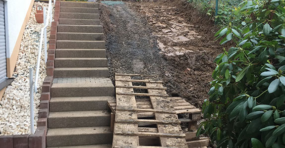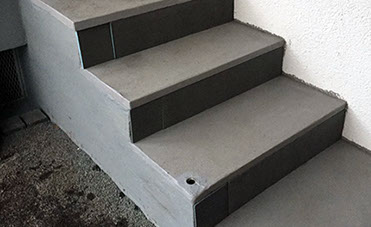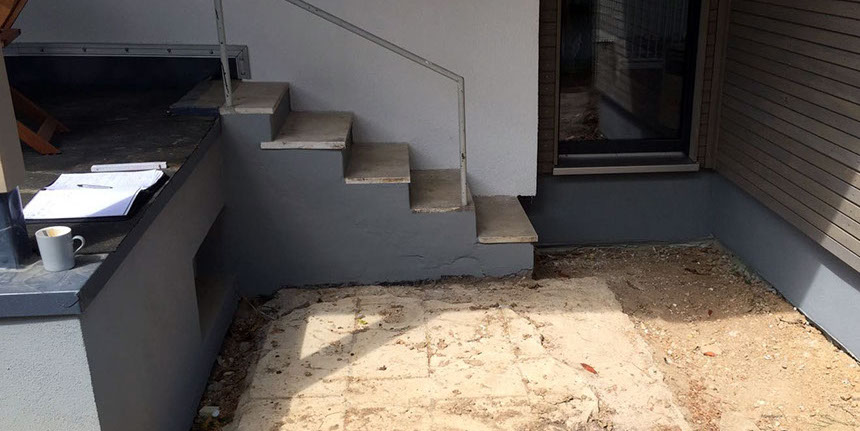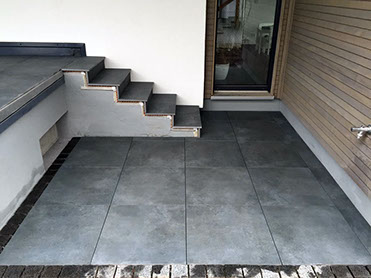 Von der Kundenseite wurde ein großformatiger Plattenbelag gewünscht. Die Wahl fiel auf Keramikplatten im Format 60x60cm, die eine Natursteinoptik und eine rutschfeste Oberfläche aufweisen. Die Treppenanlage aus Stell- und Legestufen wurde vor Ort passgenau zugeschnitten.
