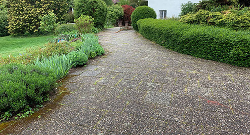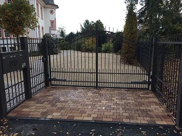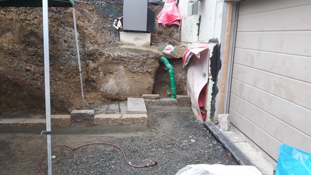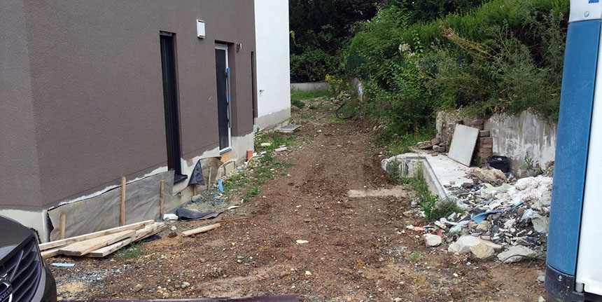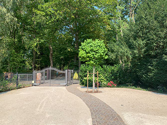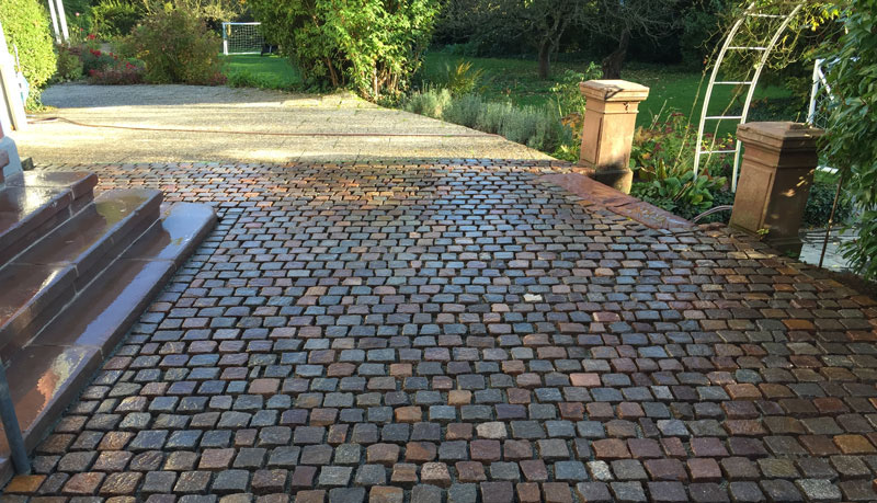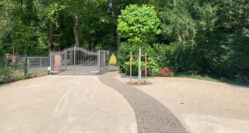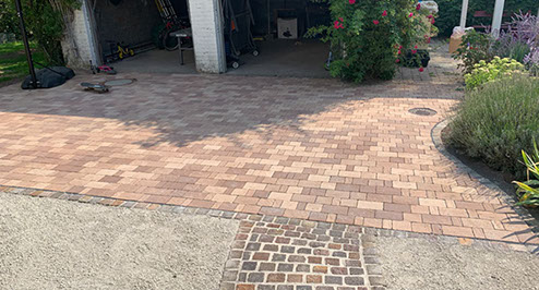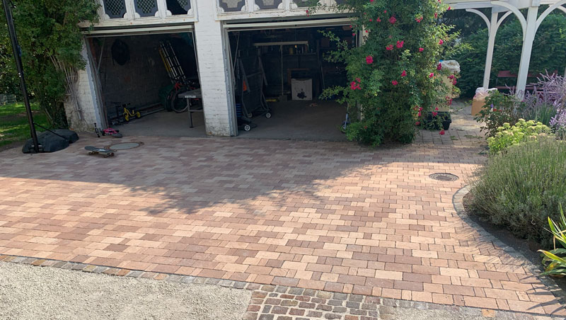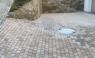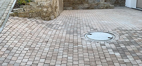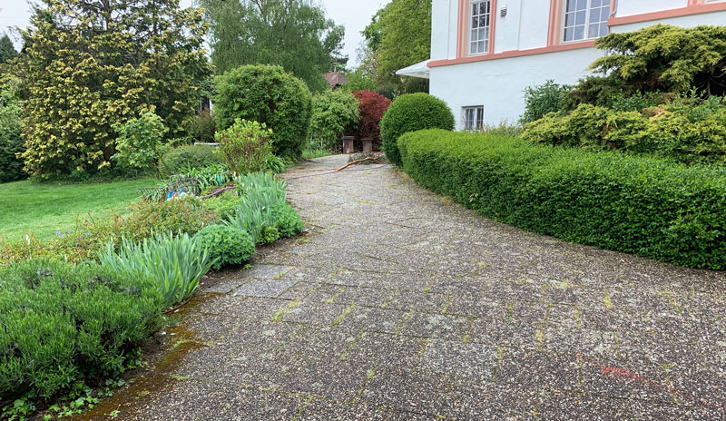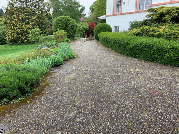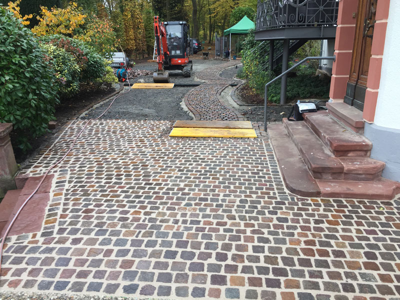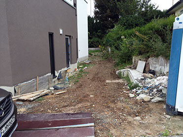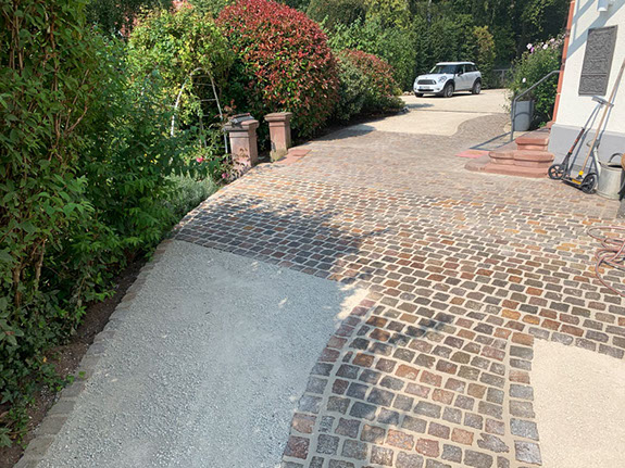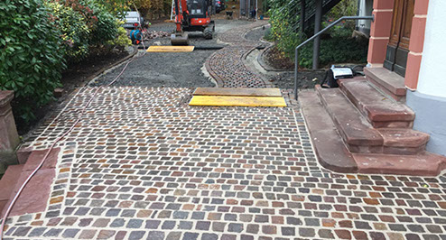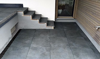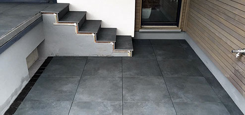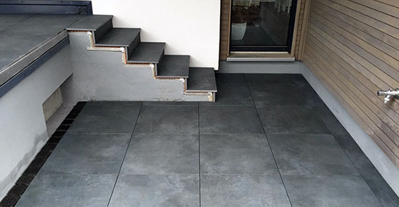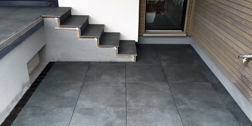 Die Zuwegungen sowie Terrassenflächen wurden mit Terrassenplatten aus Keramik in gebundener Bauweise verlegt.