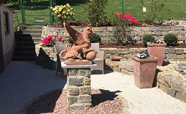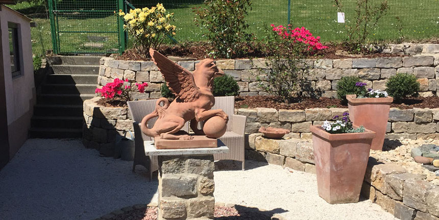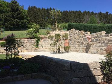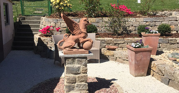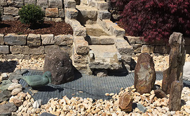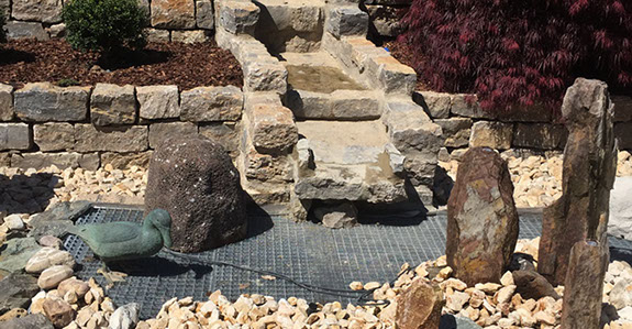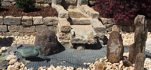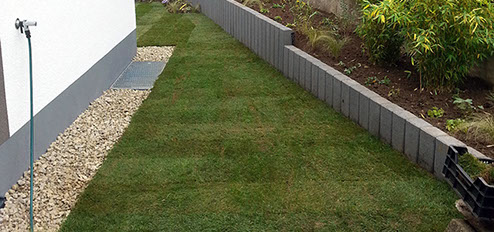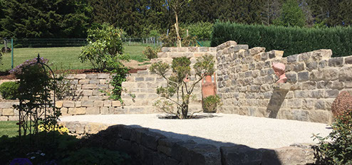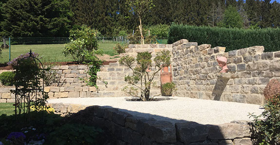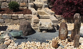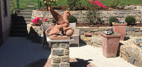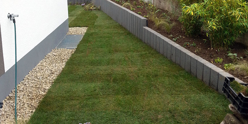 Abstützung, Bachlauf sowie Sichtschutz aus Muschelkalkmauerstein, kombiniert mit einer Zierkiesfläche. Zur Abrundung wurde Rollrasen verlegt und eine passende Pflanzung gewählt.