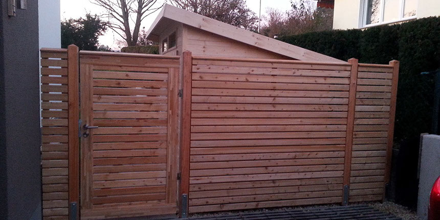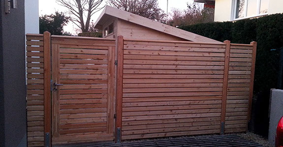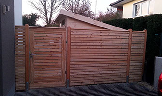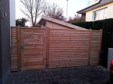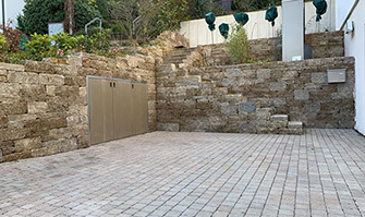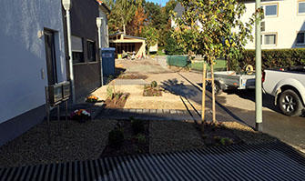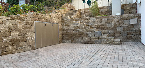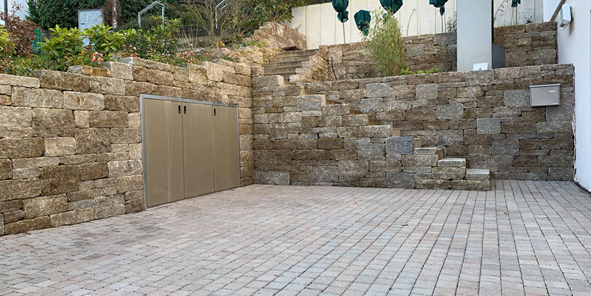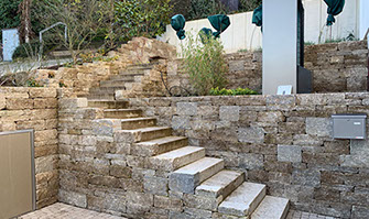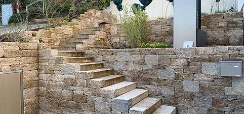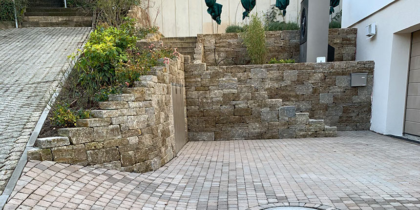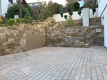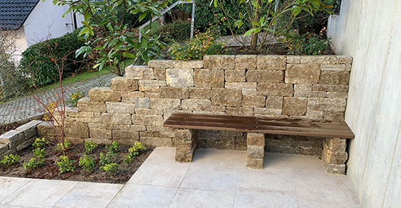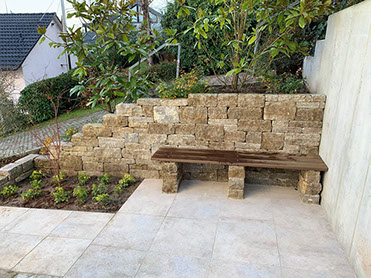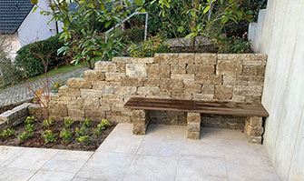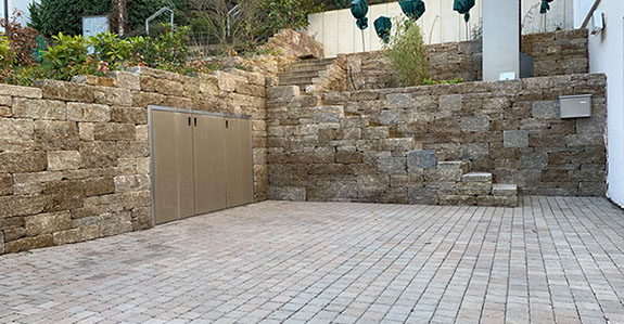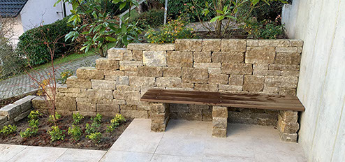 Bei der Gestaltung wurden Naturstein, Betonstein und Holz elegant miteinander verbunden. Die Herausforderung lag darin, Höhenunterschiede, sowie Fluchten von Grundstück und Bauwerk bei Planung und Ausführung zu berücksichtigen.