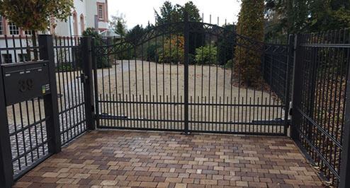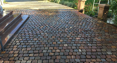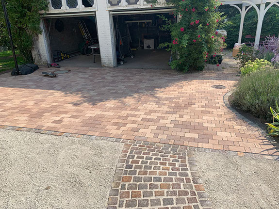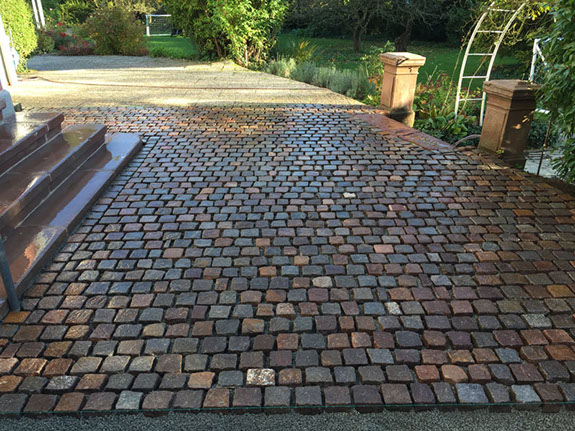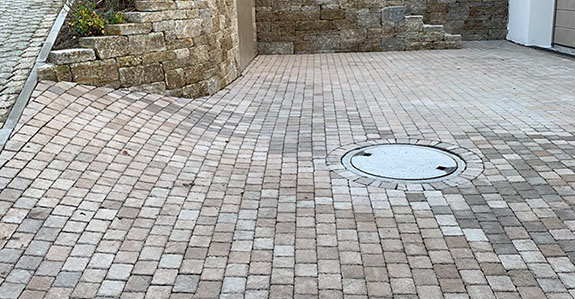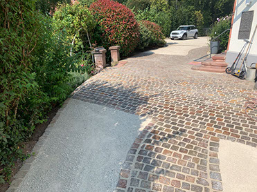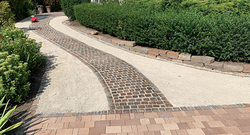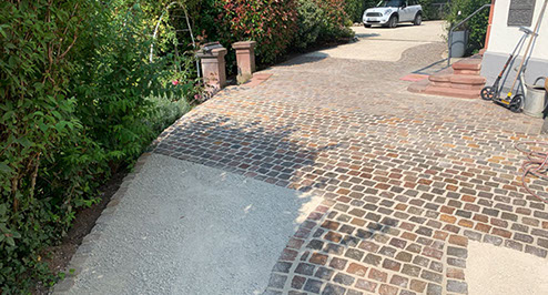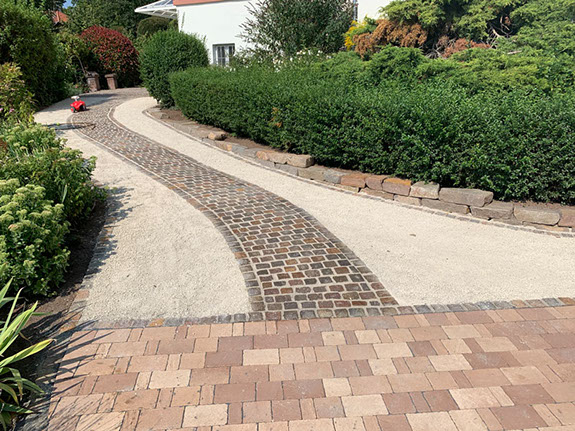 Gestaltung eines Einfahrtsbereiches mit Natur- und Betonsteinmaterialen kombiniert.